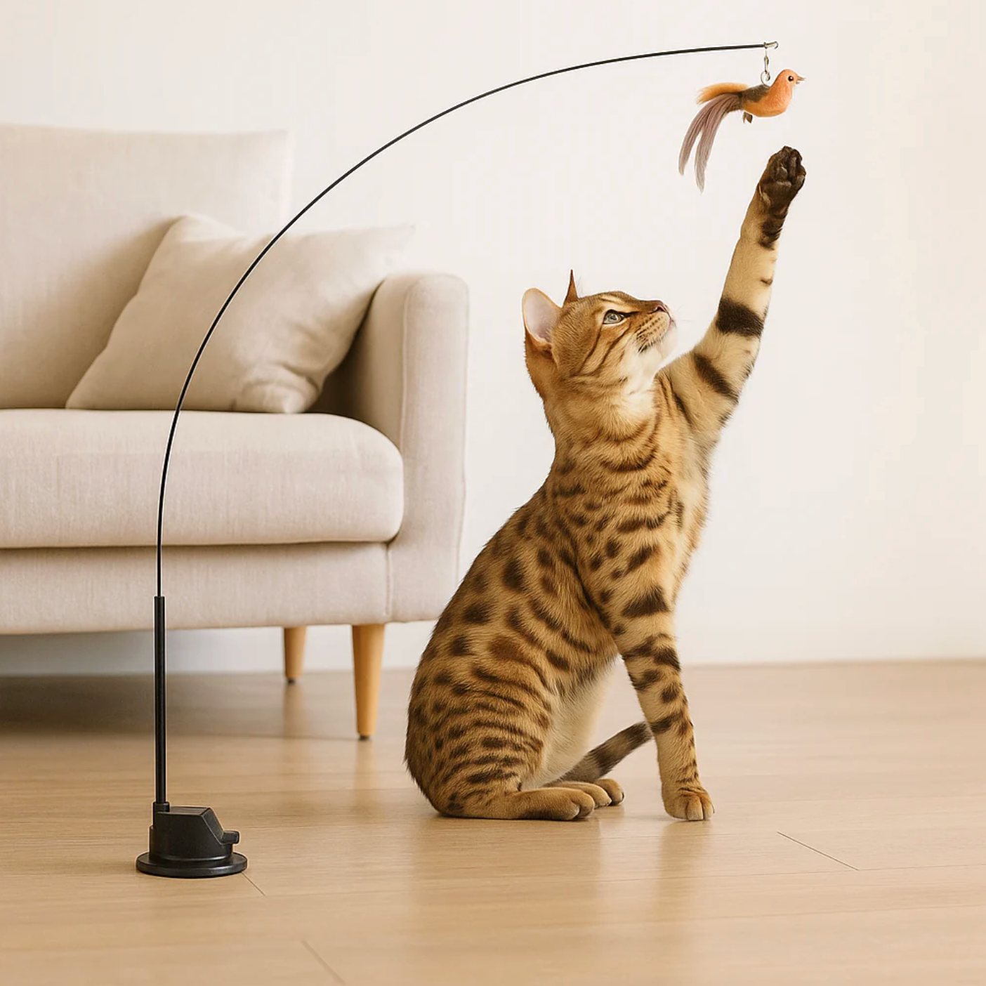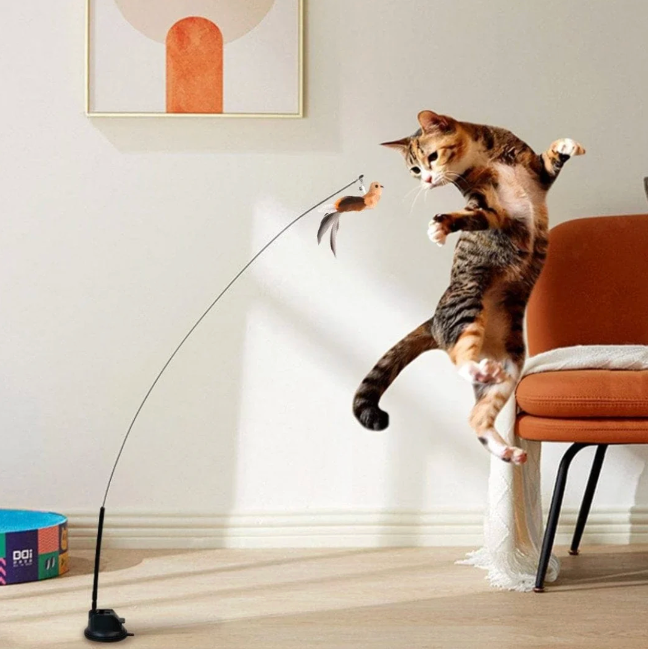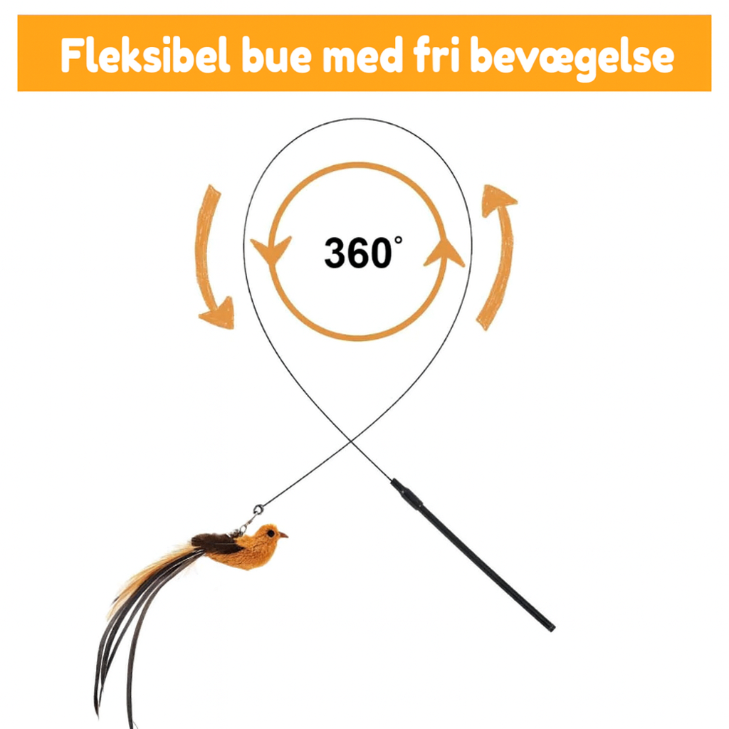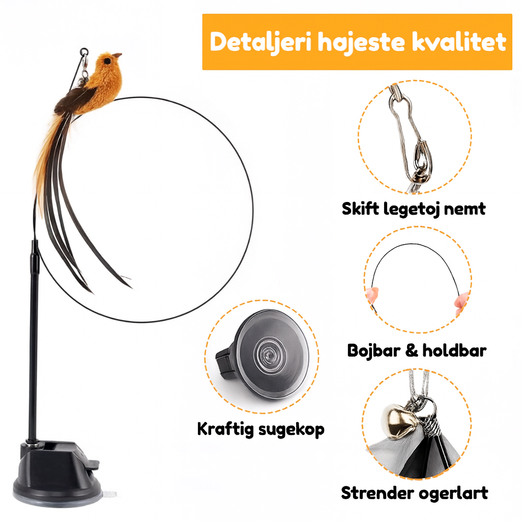 Det fjerklædte legetøj svinger sig gennem luften, hvilket gør hver lege-runde spændende og udfordrende. Nem at montere, stabil med sugekop – og helt uimodståelig for katte.