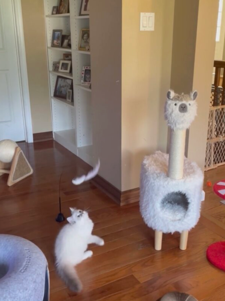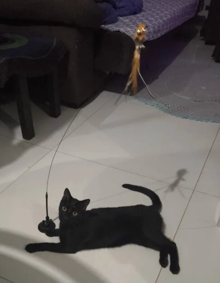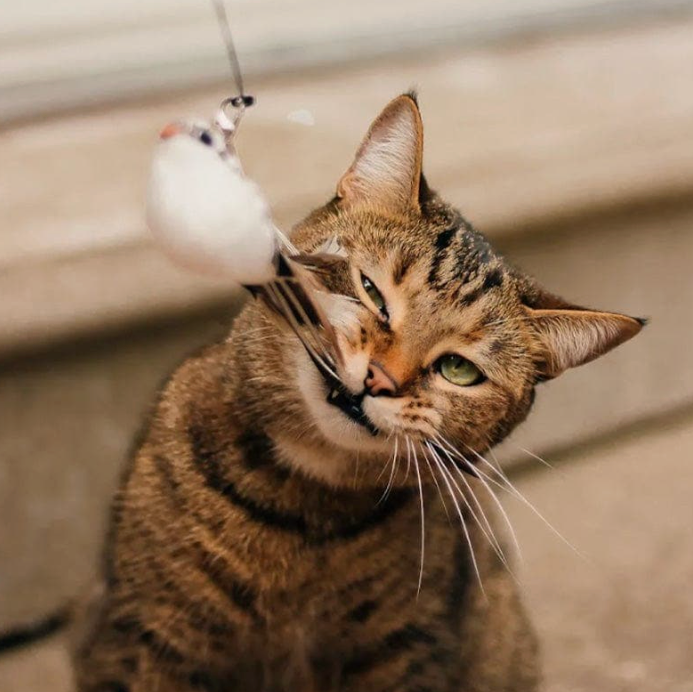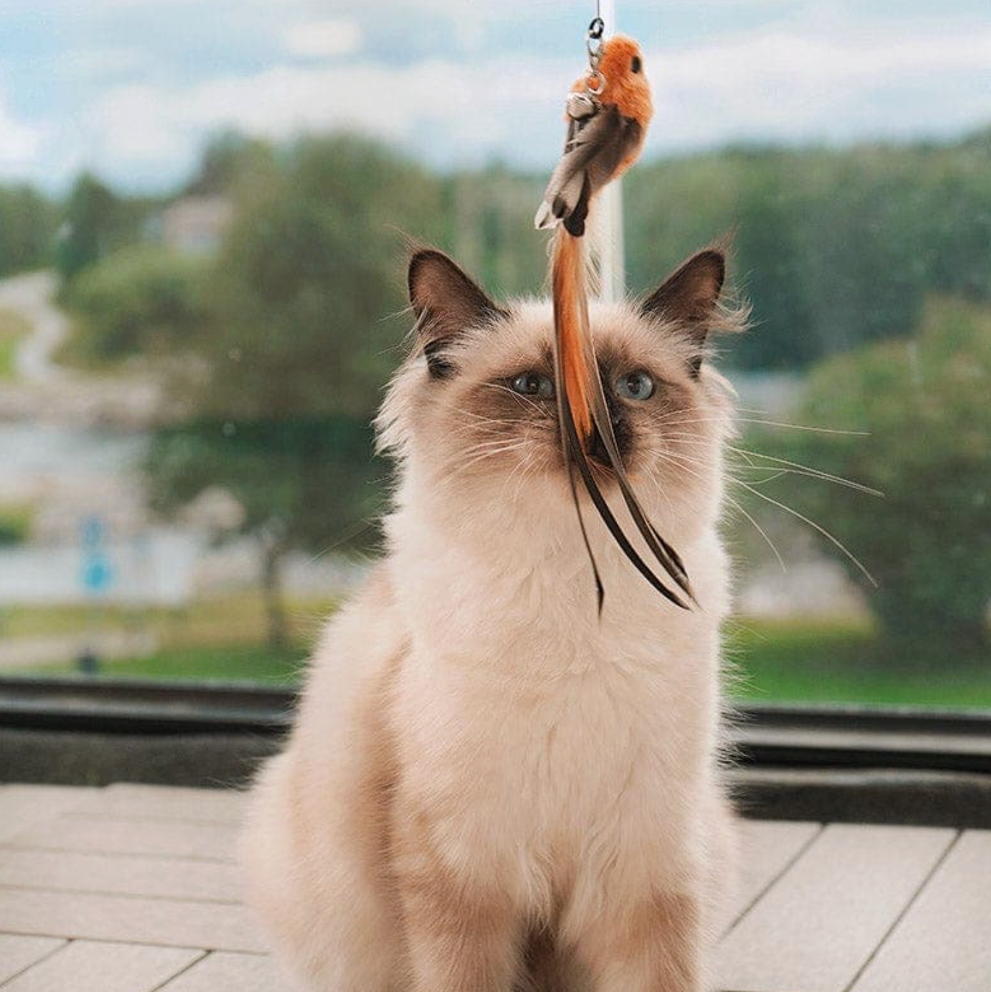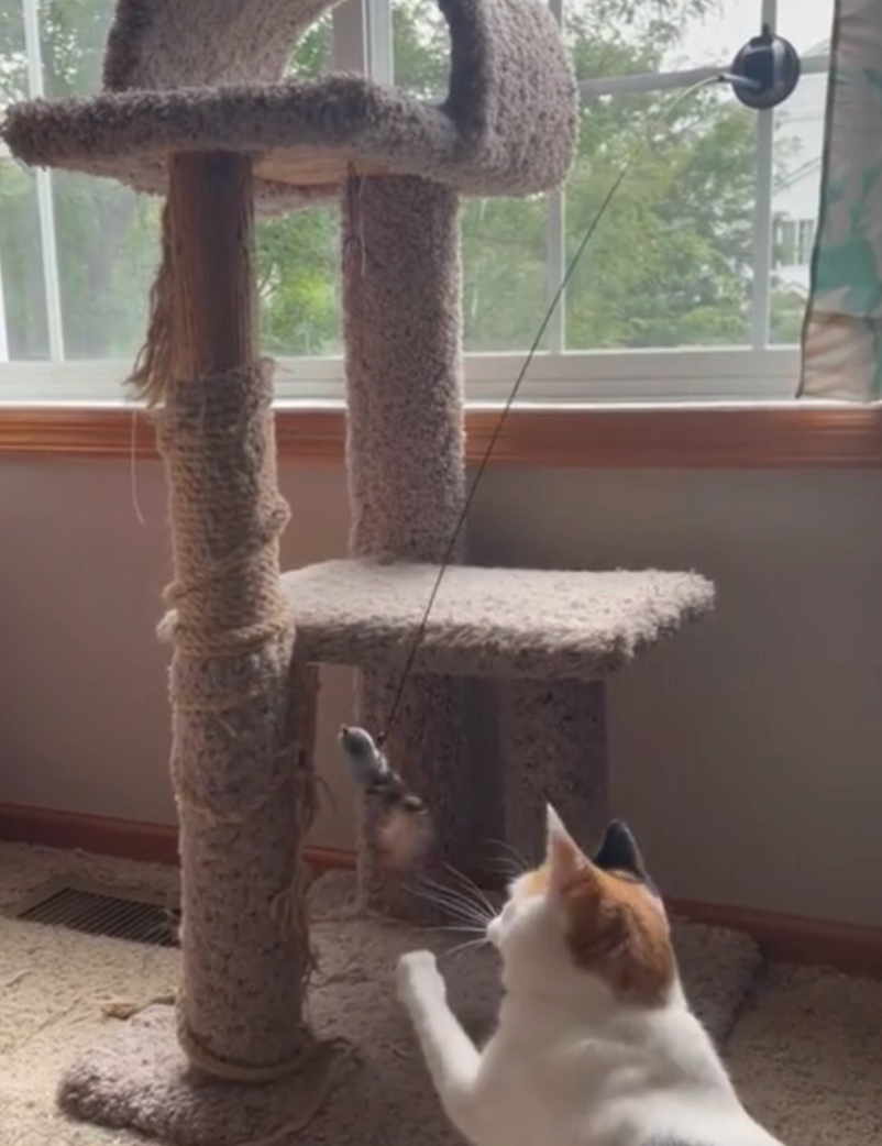 Det fjerklædte legetøj svinger sig gennem luften, hvilket gør hver lege-runde spændende og udfordrende. Nem at montere, stabil med sugekop – og helt uimodståelig for katte.